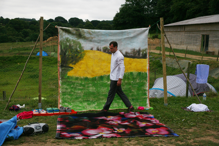 Au son d’une playlist jouée sur radio-cd, Guillaume Pellay manipule et présente des formes (peintures, costumes et souliers) pour recueillir et mettre en lumière gestes et récits.