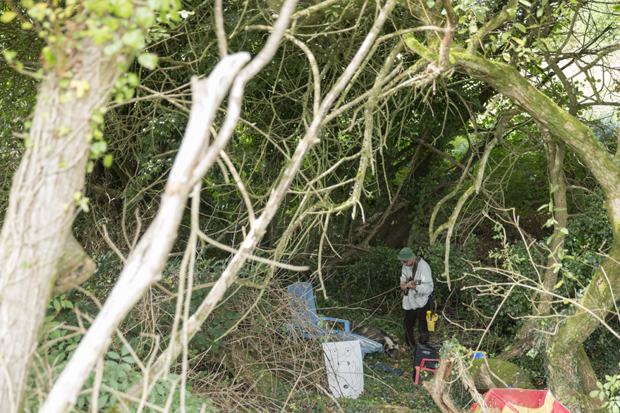 Vêtu d’un imper beige et d’un bob, Yann Baïzid balade une colonie d’instruments sur son dos (claviers, guitares, percussions jouets, dictaphone…), ainsi il sillonne les terrains de la ferme et monte des campements bricolés dans lesquels il se produit : musique improvisée, feu de camp et dessin libre. Vagabond en marge du festival, il n’était pas annoncé dans la programmation, les spectateurs tombaient sur lui par hasard ou entendaient au loin sa musique.